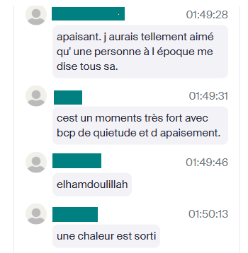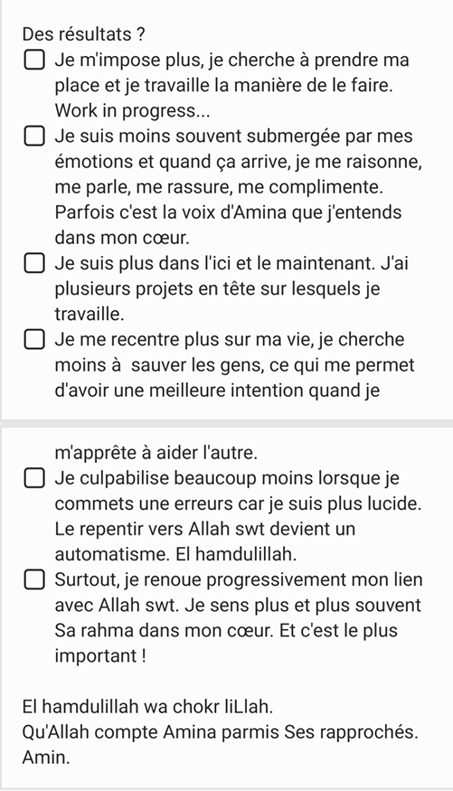 Cela faisait des années que je n'allais pas bien (...) J'ai enfin compris comment et pourquoi j'étais plongé dans ce mal, mais en plus j'en suis sorti... Maintenant je suis capable de m'apporter exactement ce dont j'ai besoin au bon moment, tout en améliorant ma connexion à Allah.