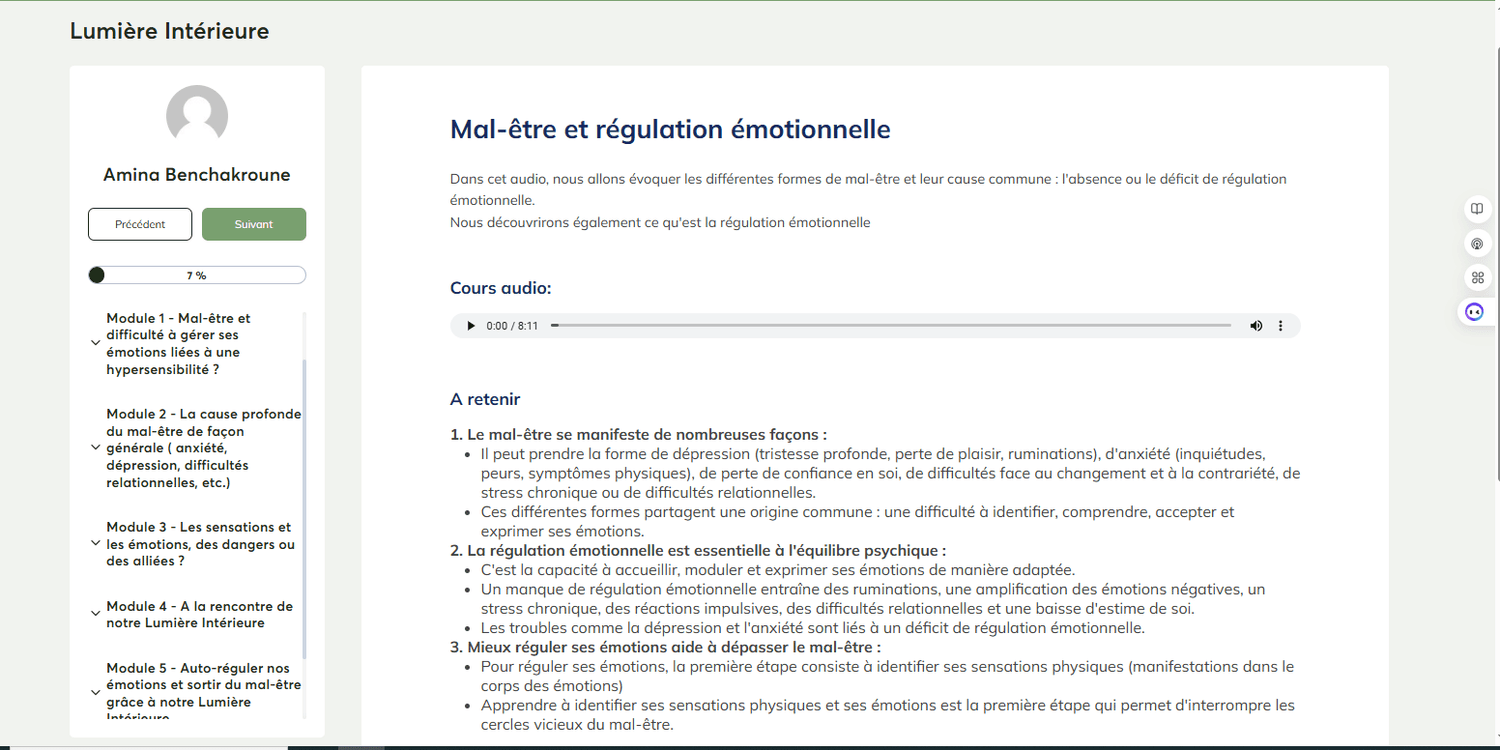 Vous avancez module après module à votre rythme, vous écoutez des audios conçus pour vous amener progressivement à la régulation émotionnelle, vous téléchargez des fiches-outils concrètes, et vous avez la possibilité de poser vos questions lors des lives.